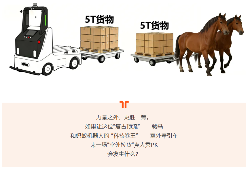 蒸汽机时代,有一个直观而形象的计量单位——“马力”,用以衡量一匹成年马能提供的牵引力,时至今日,我们依然常用“马力”来形容设备的动力。那么,一匹成年马的“马力”是多少?在理想条件下,一匹健康的成年马,最大短时牵引力可达2.9-3.5kN,这,几乎是生物极限。而在蚂蚁室外牵引车身上,以5T的牵引车为例,额定牵引力6kN,换句话说,一台车 = 2匹马的巅峰力量 × 24小时不停歇。